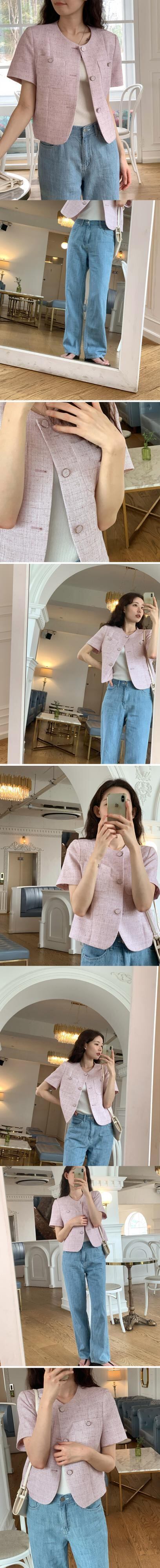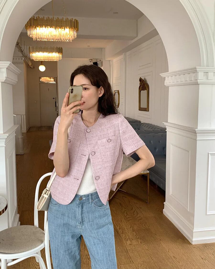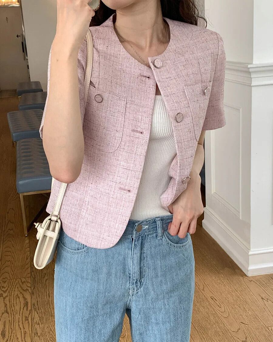 春甘いコートラウンドネックルーズ半袖ジャケット ショート ハーフスリーブ 大人ガーリー スウィート キュート カジュアル スプリング 春物 Oネック
