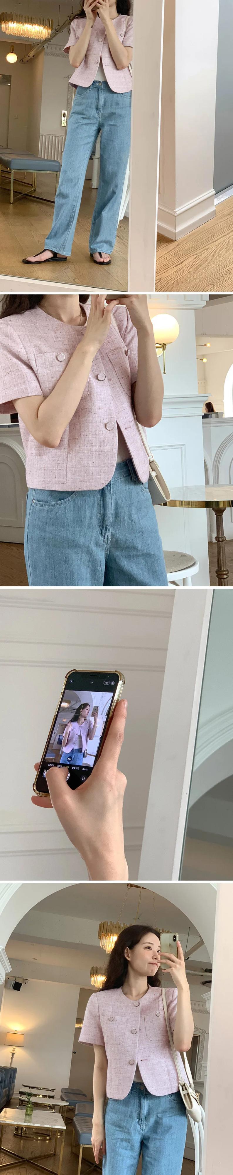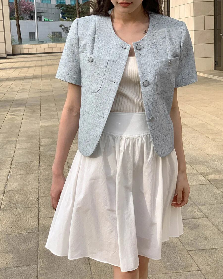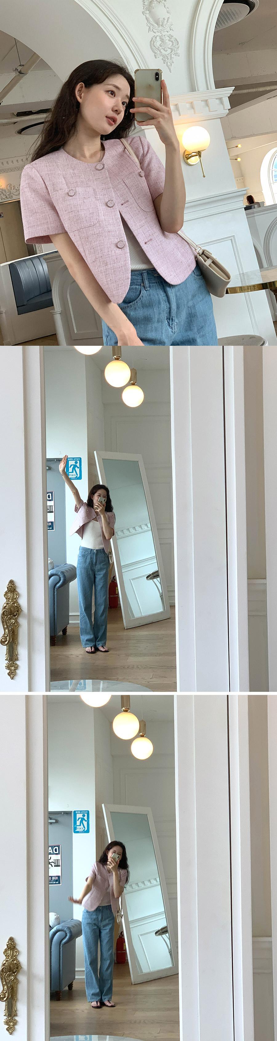 春甘いコートラウンドネックルーズ半袖ジャケット ショート ハーフスリーブ 大人ガーリー スウィート キュート カジュアル スプリング 春物 Oネック
