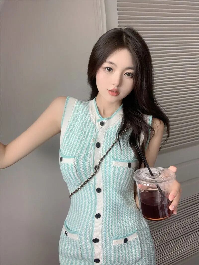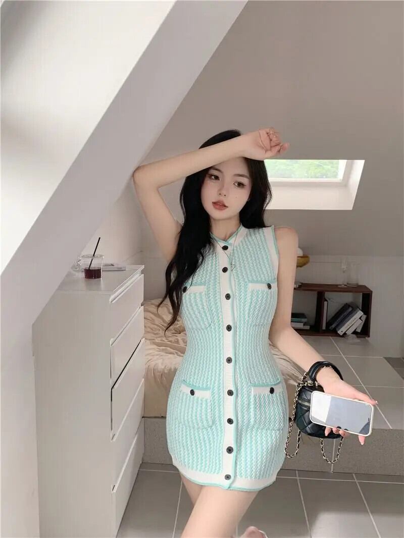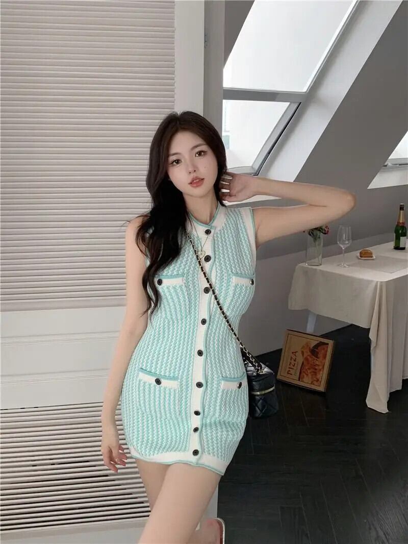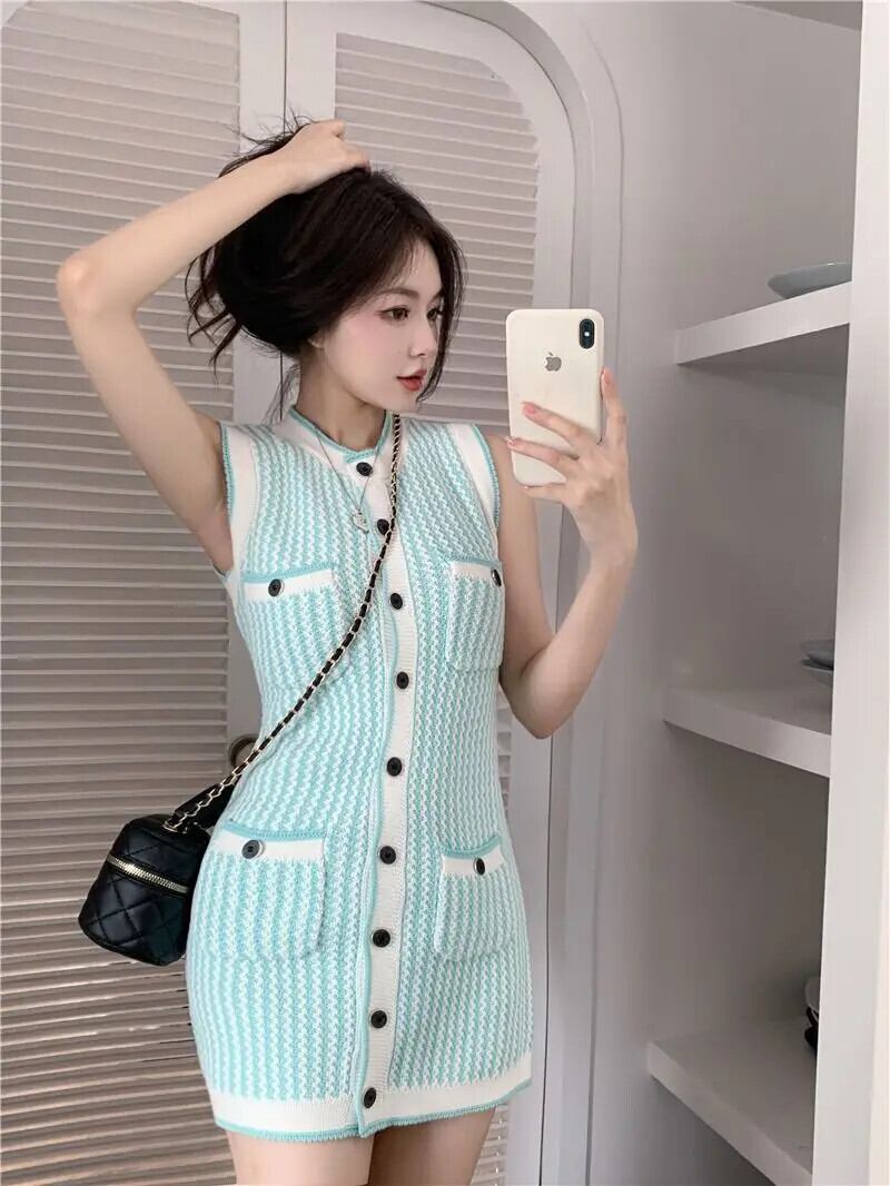 サマースタイルレディースショートストライプノースリーブタンクトップニットドレス 夏物
