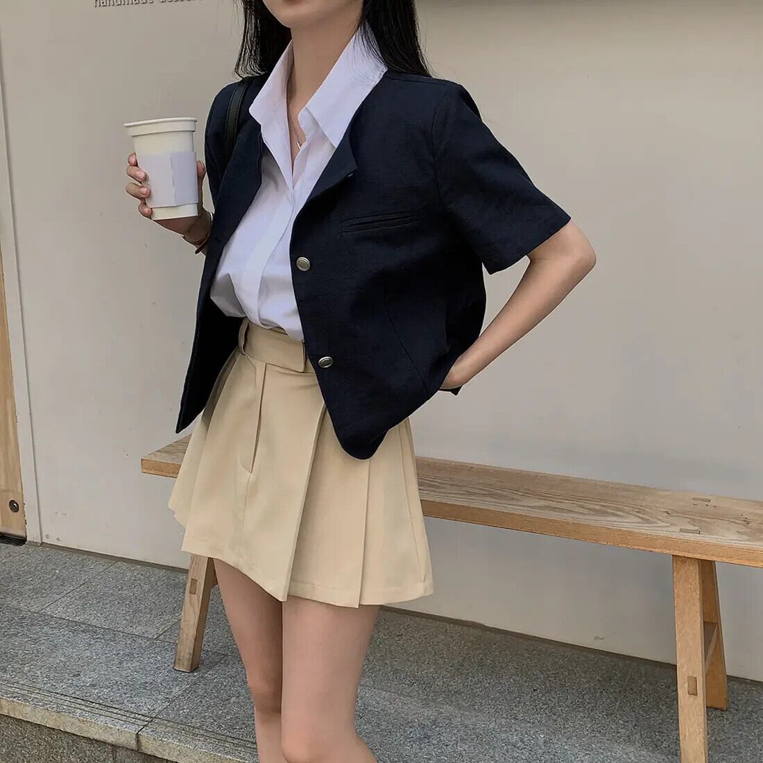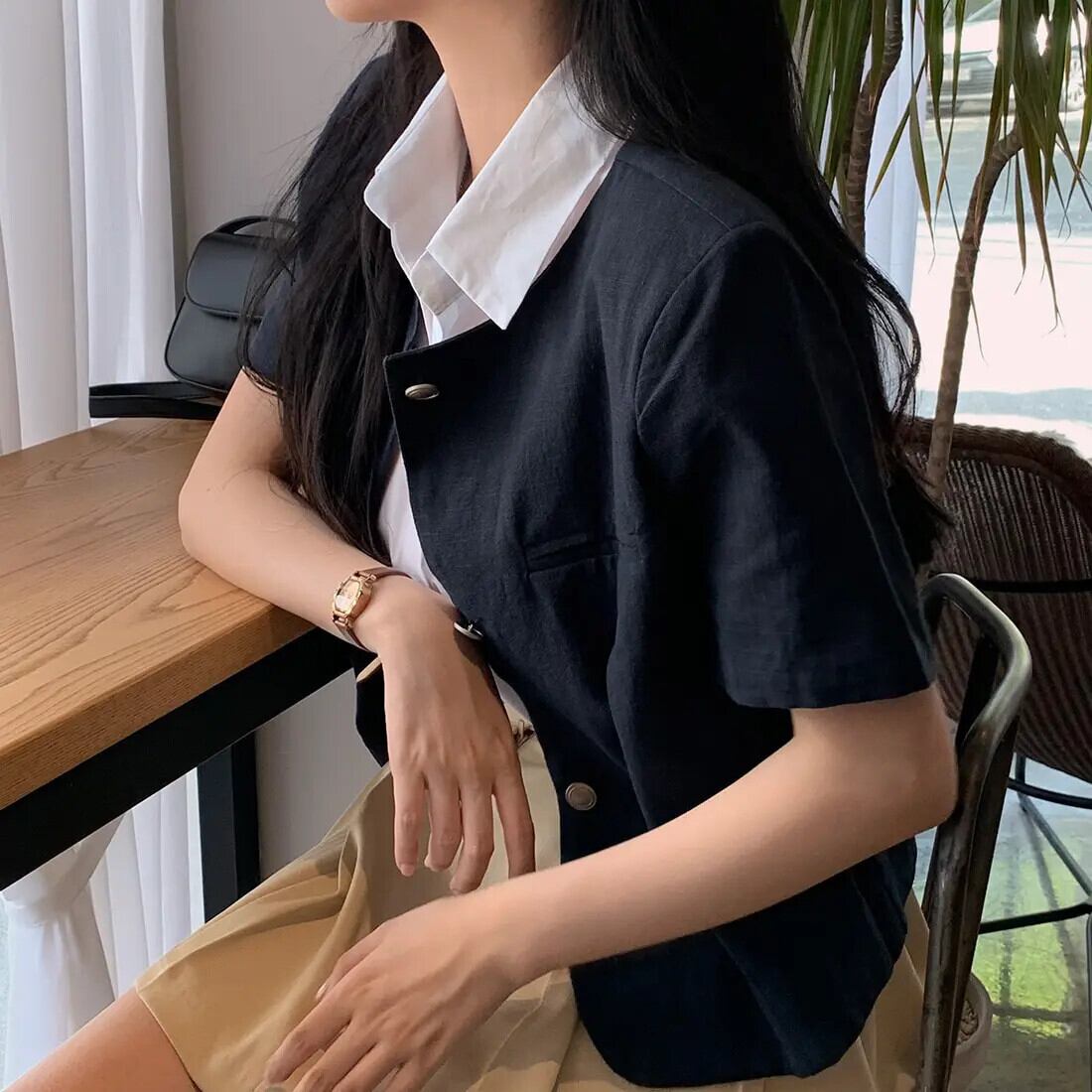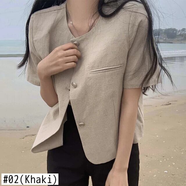 夏レトロスタイルラウンドネックルーズソリッドカラーシングルブレスト半袖香りコートジャケット ショート ハーフスリーブ サマー 夏物 Oネック