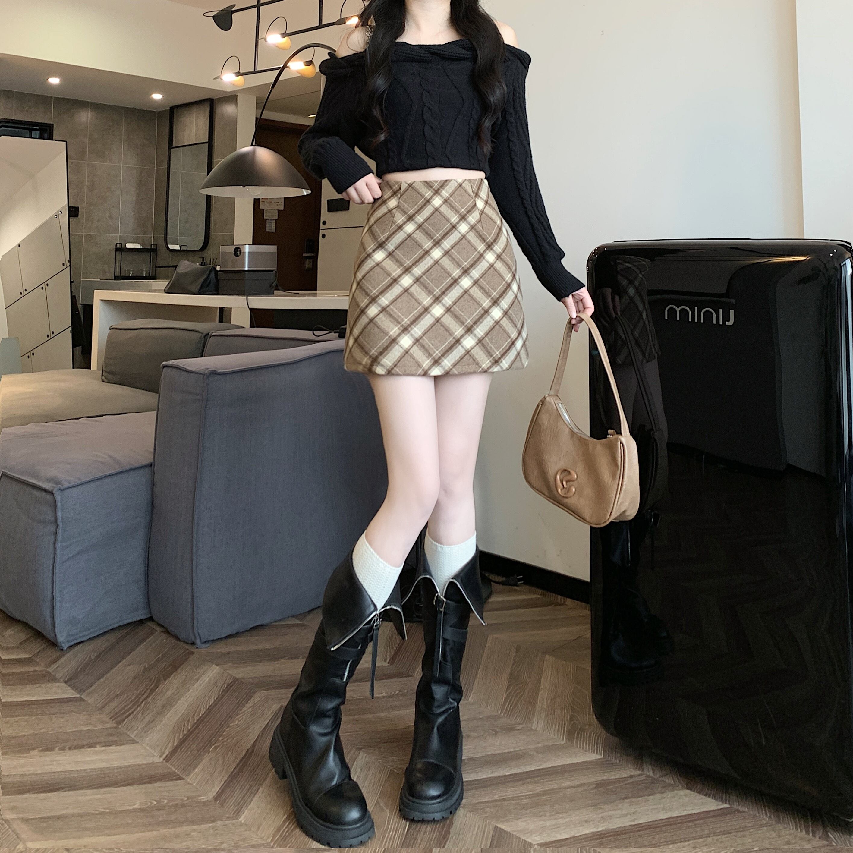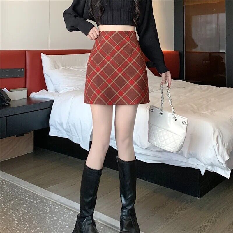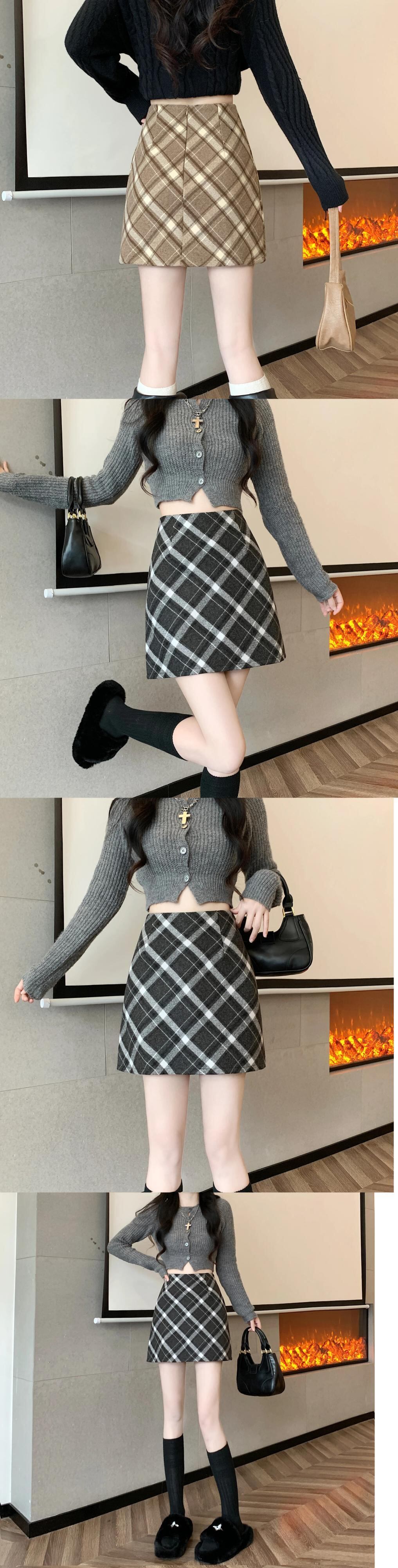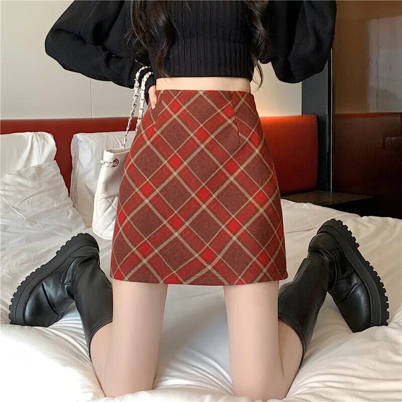 レトロレディース秋冬シックウエストAラインチェック柄ウールハーフスカート オータム 秋物 ウィンター 冬物