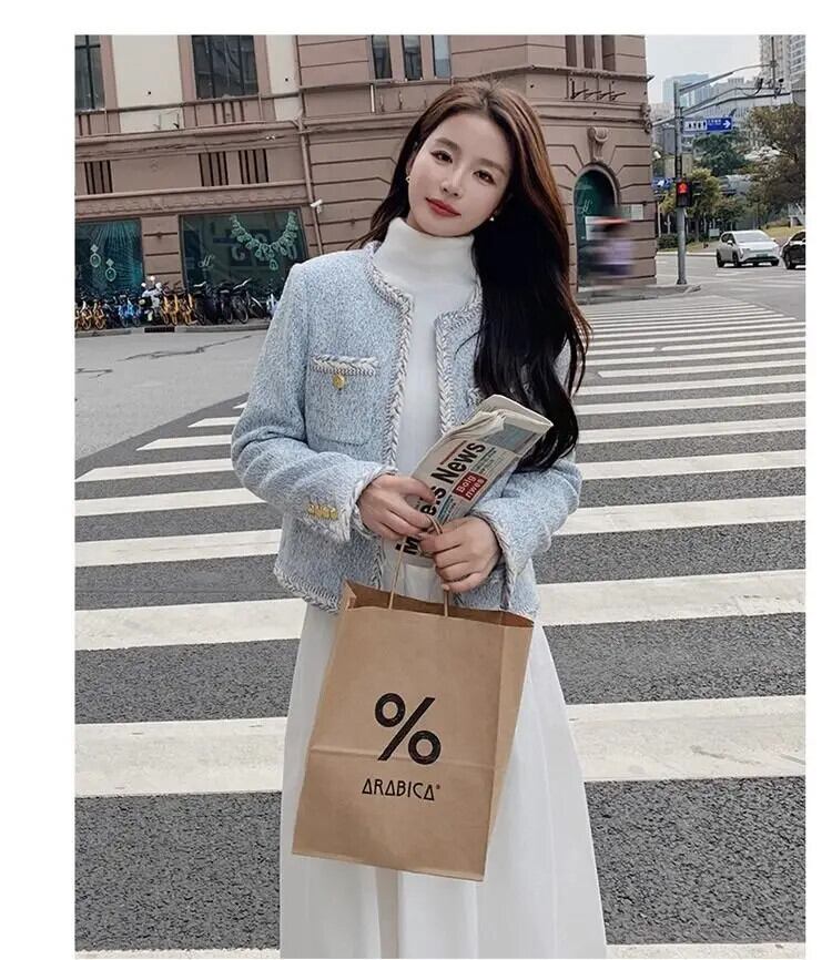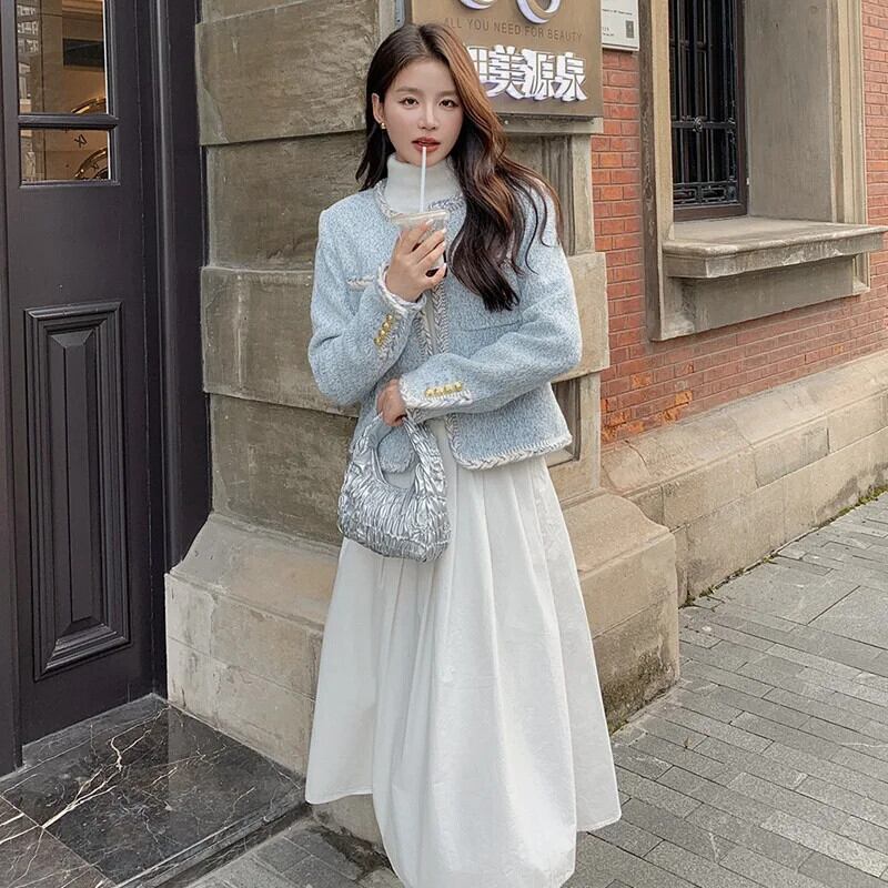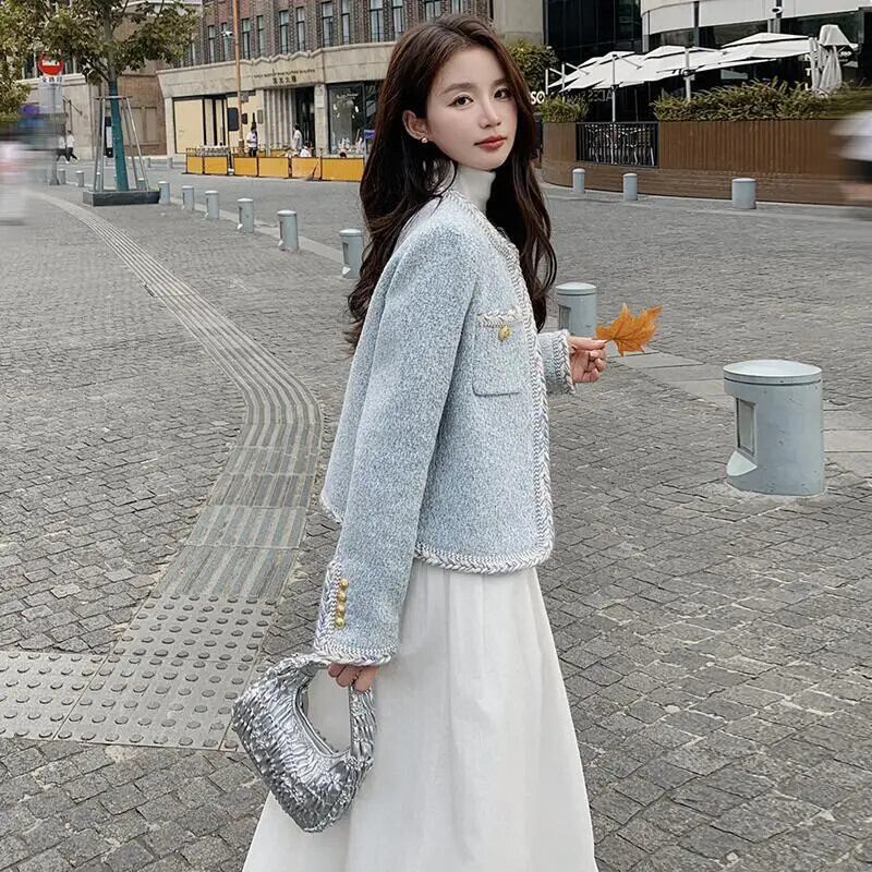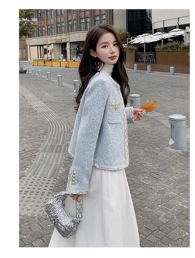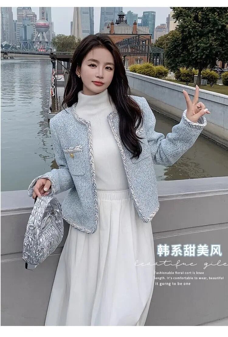 春秋粗ツイードルーズ長袖コートショートブルージャケット ロング スプリング 春物 オータム 秋物