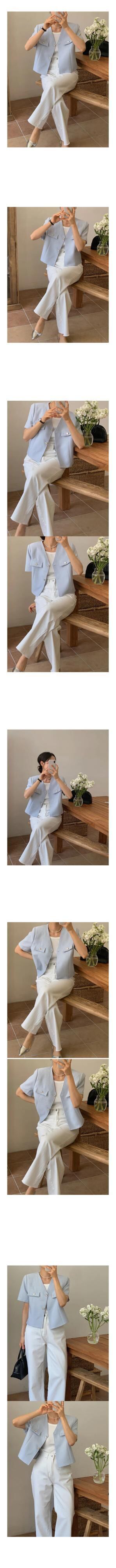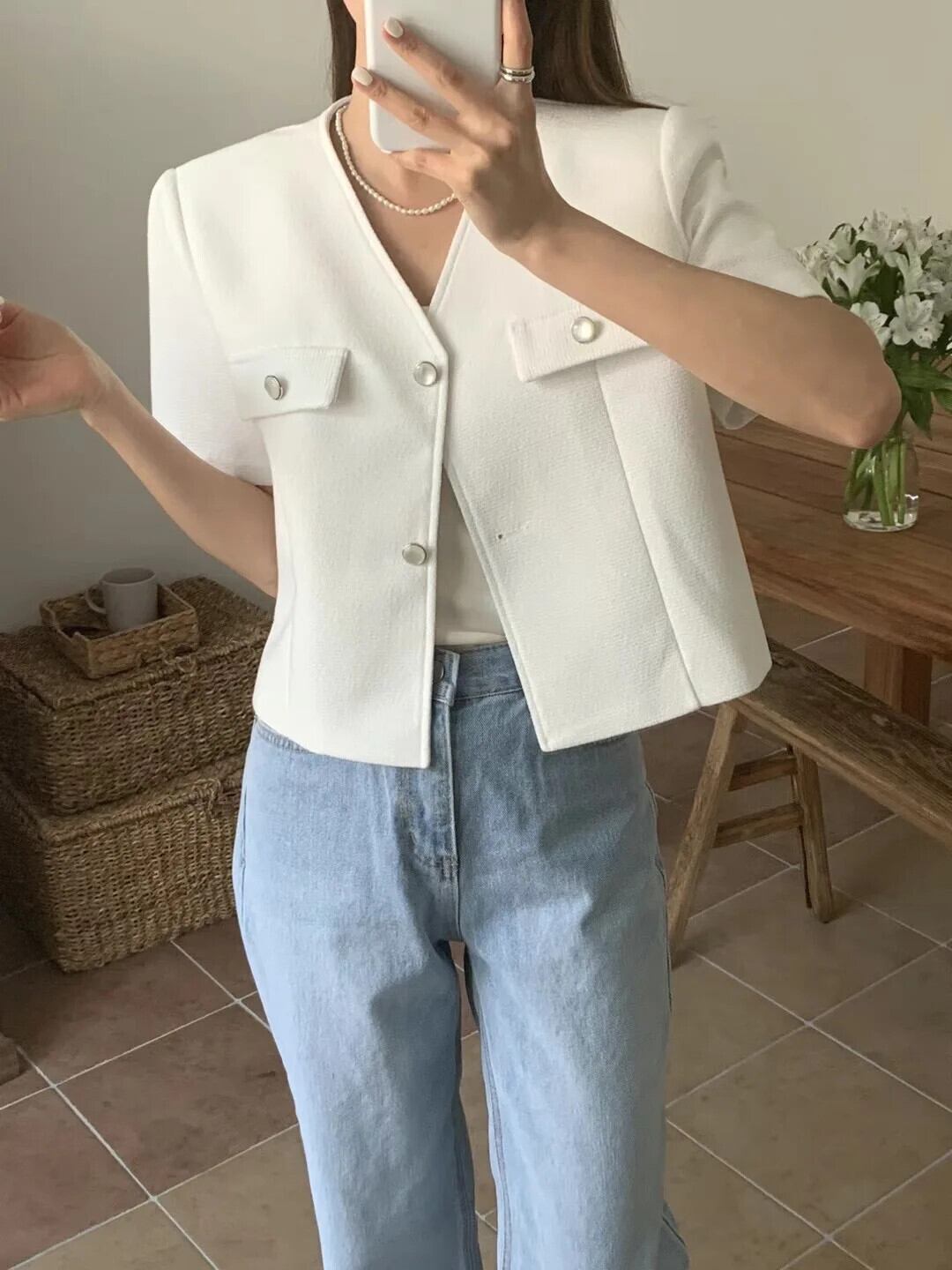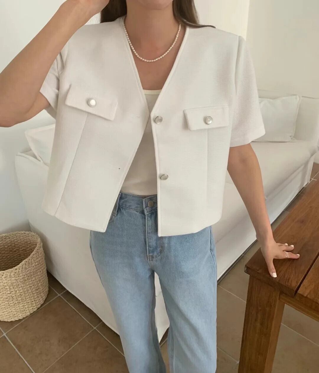 サマーパールシングルブレストルーズ半袖Vネック粗ツイードジャケットコート ショート ハーフスリーブ 夏物 真珠