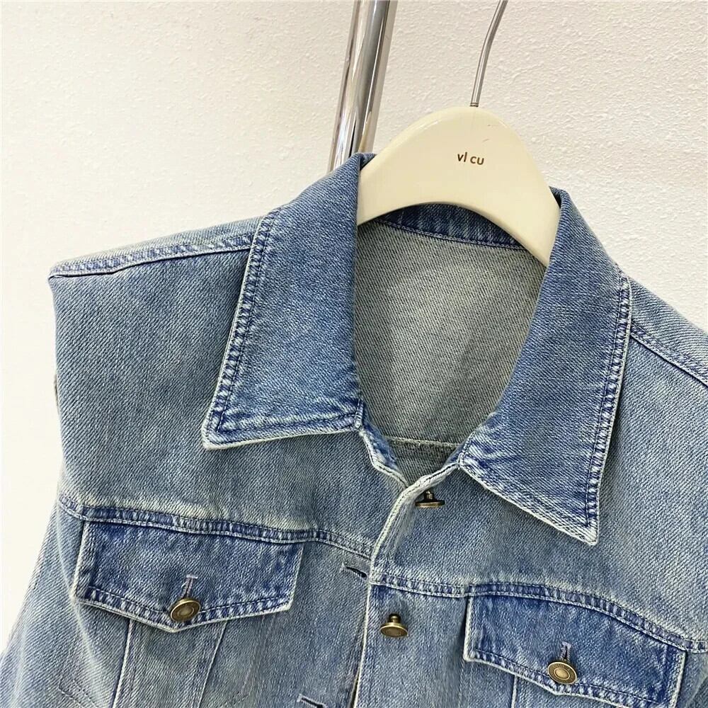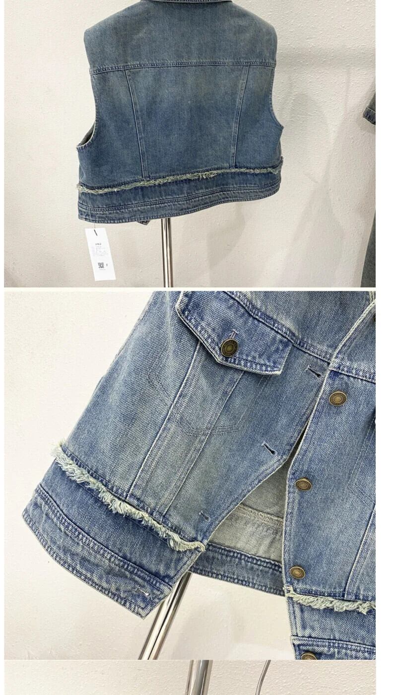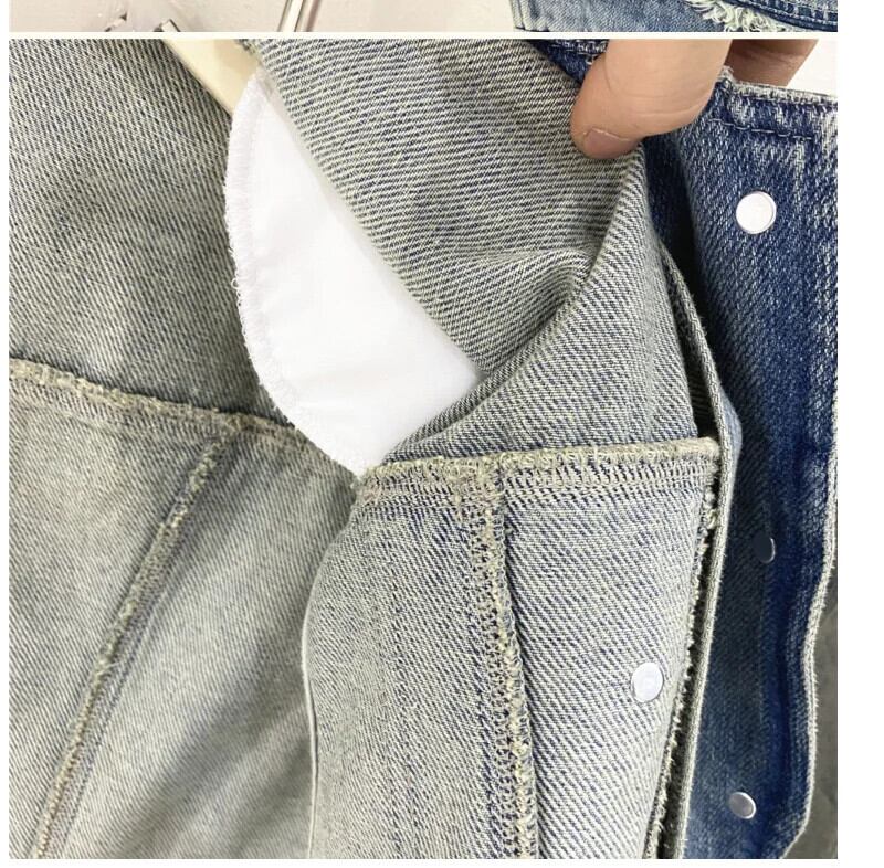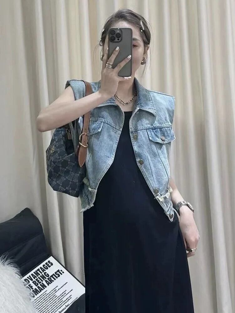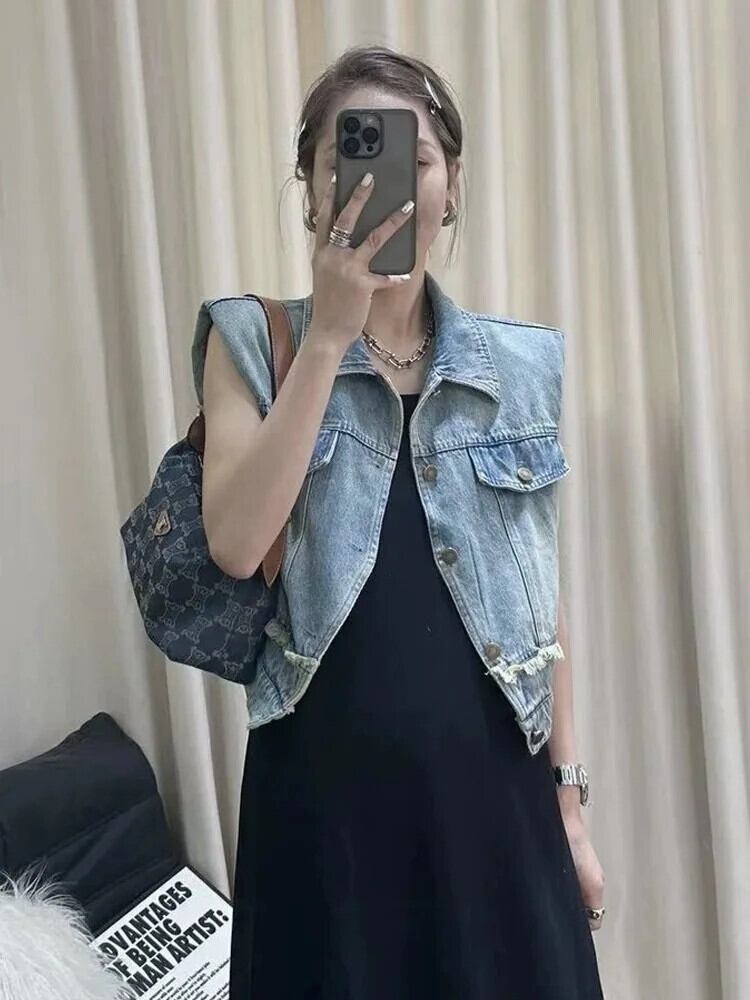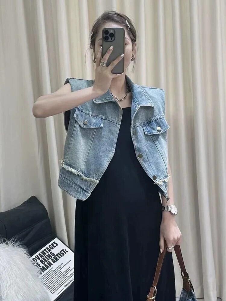 夏ルーズラペルデニムベストジャケットファーエッジショルダーパッド入りチョッキ サマー 夏物
