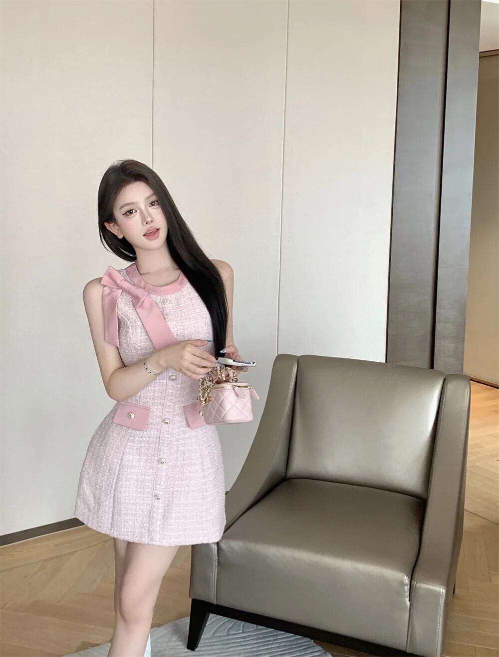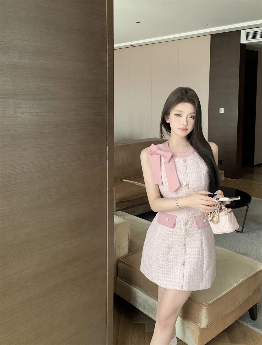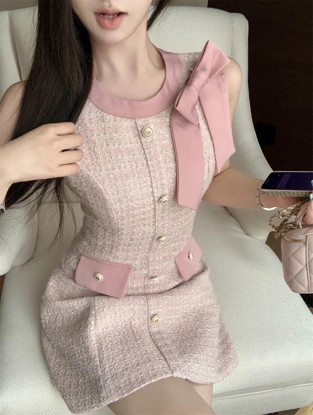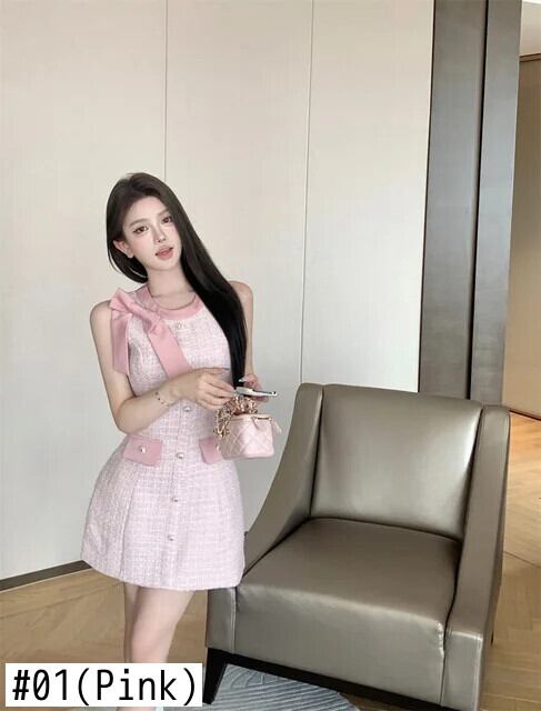 夏ツイード気質香りスタイルリボンノースリーブベストドレス サマー 夏物