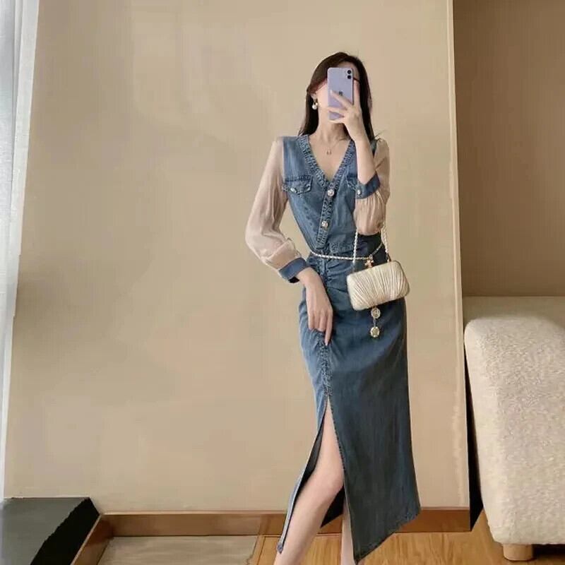 Vネック春長袖レシーブウエストデニムスリットタイトイレギュラードレスレディース ロング スプリング 春物
