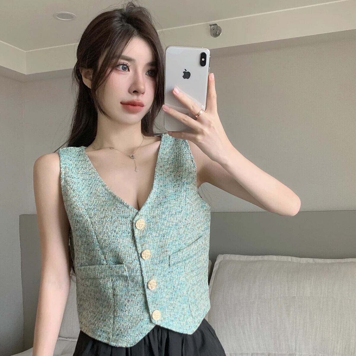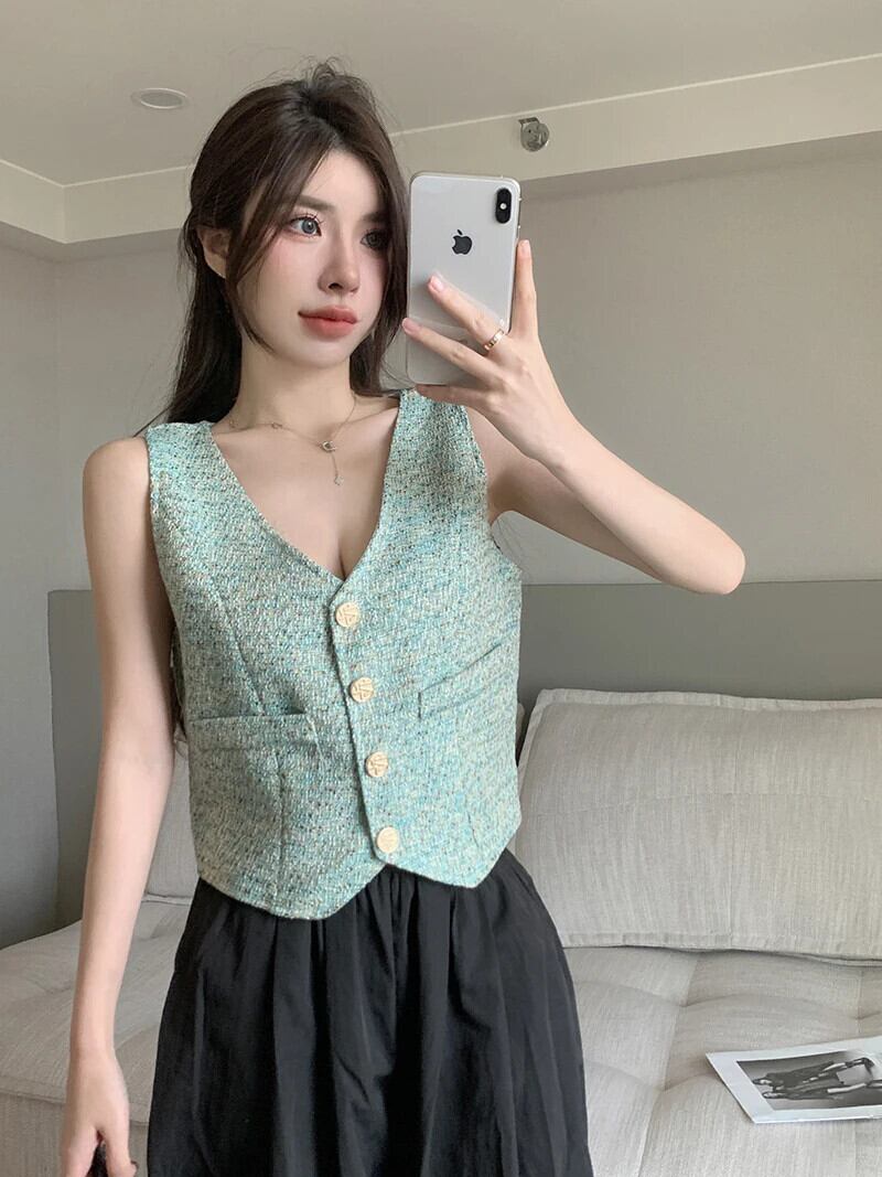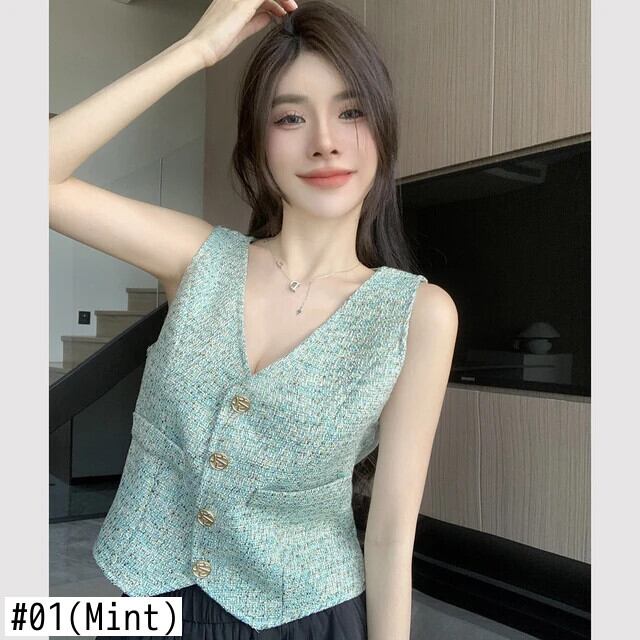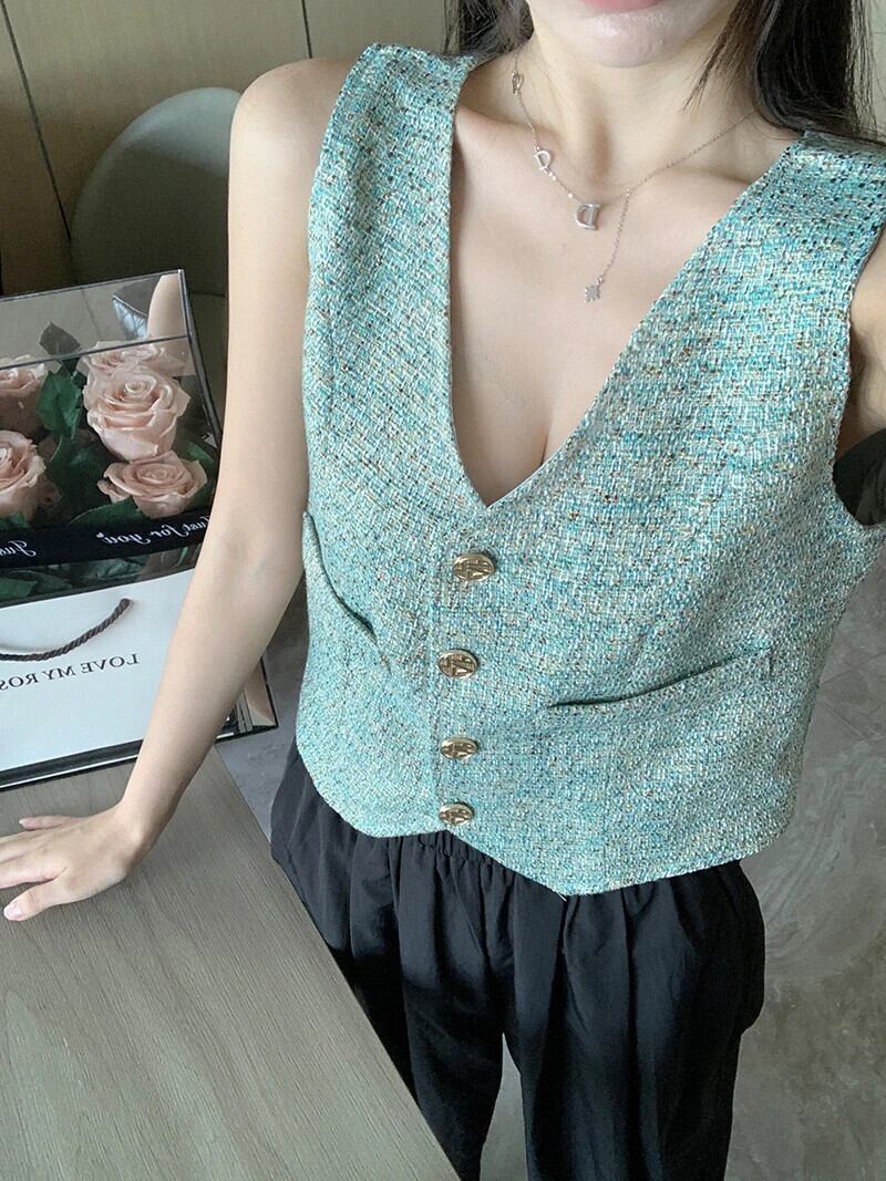 夏ルーズ V ネックシングルブレストスリムフィットノースリーブタンクトップカラフルツイードベストガール サマー 夏物 Vネック