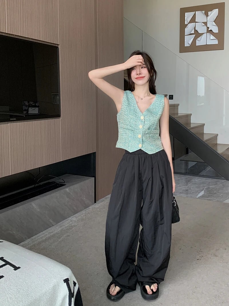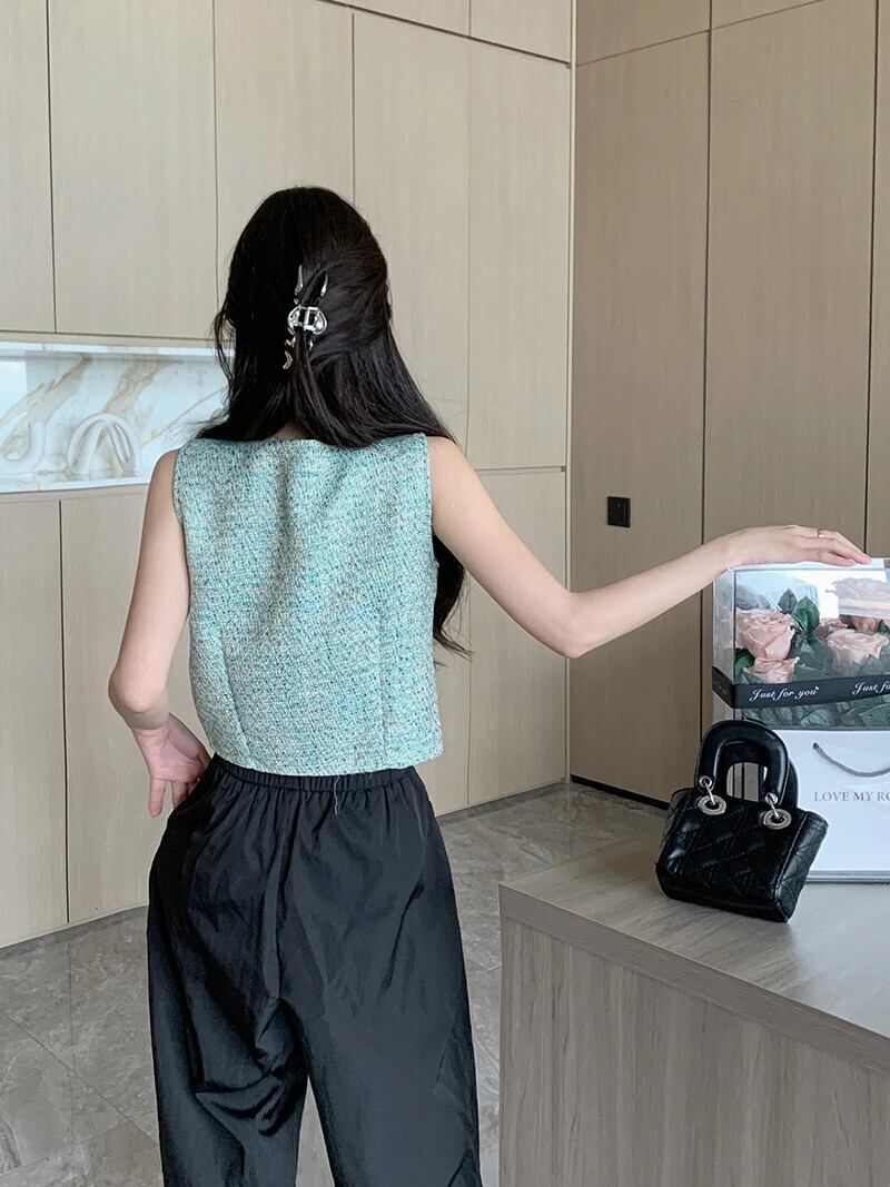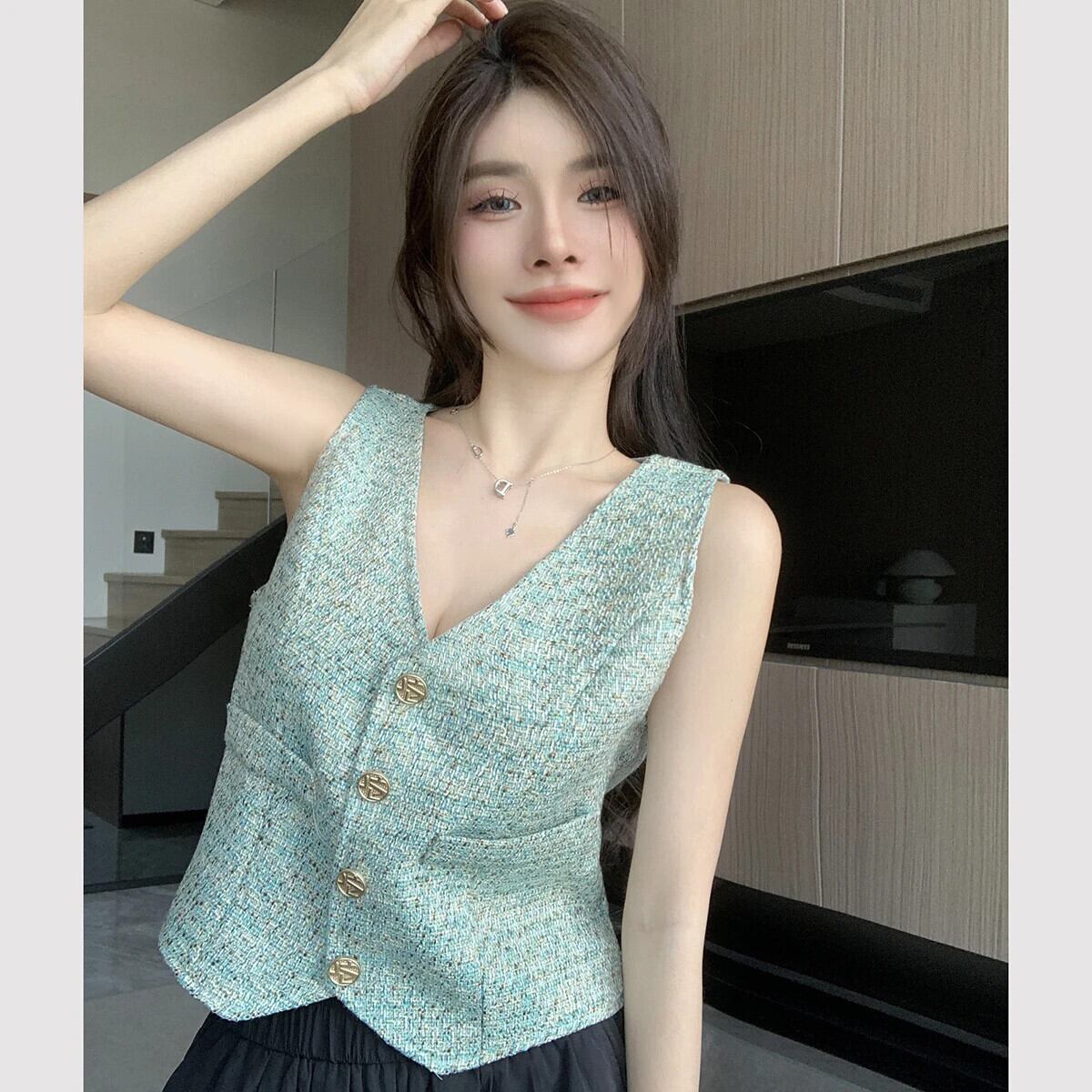 夏ルーズ V ネックシングルブレストスリムフィットノースリーブタンクトップカラフルツイードベストガール サマー 夏物 Vネック