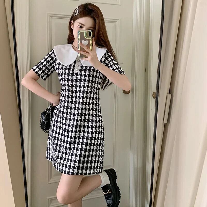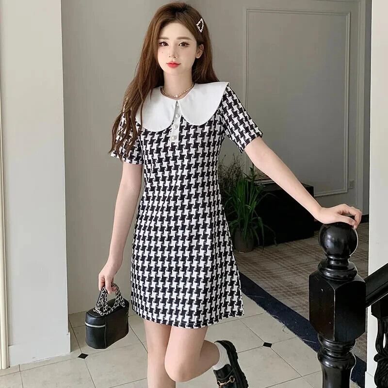 夏アカデミー スタイル M-4XL チェック スイート ドール ネック ドレス Vestido レッド 大人ガーリー スウィート キュート カジュアル サマー 夏物