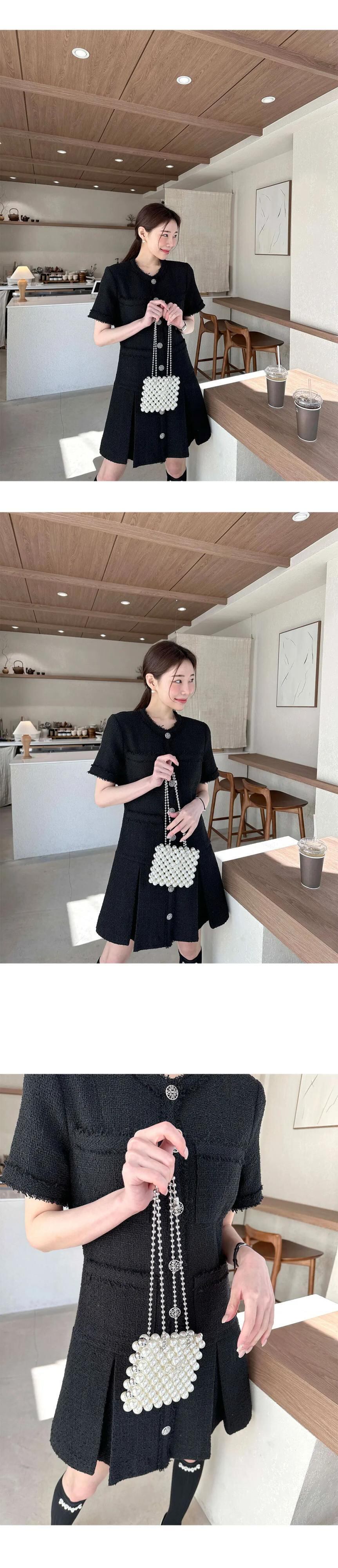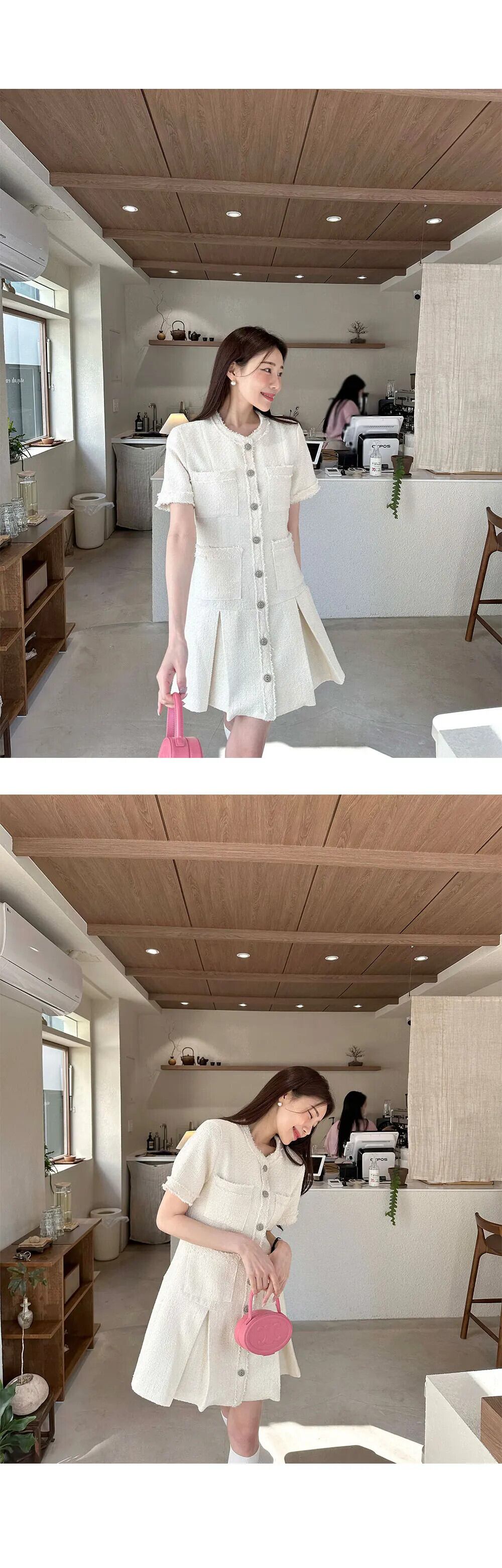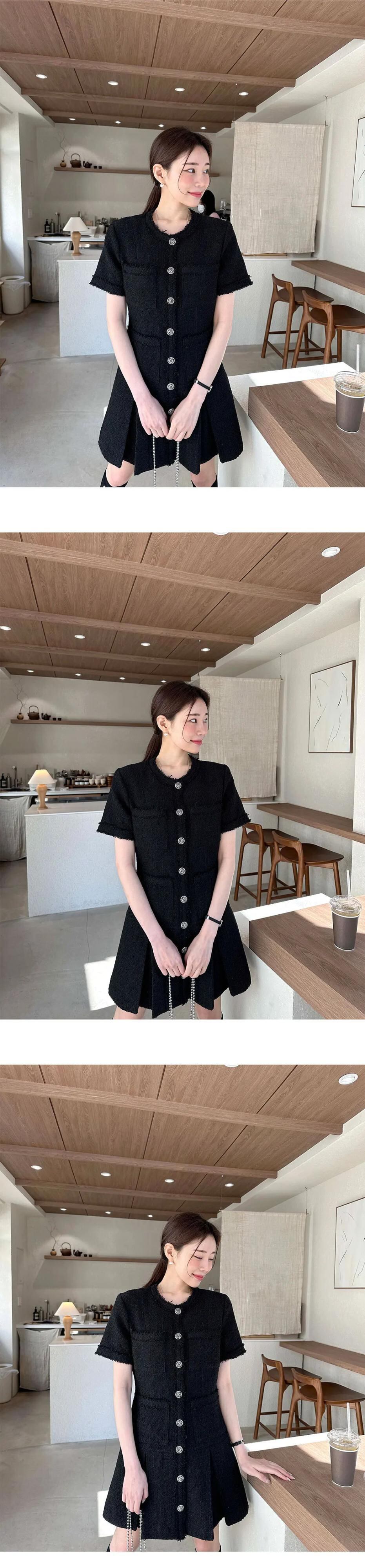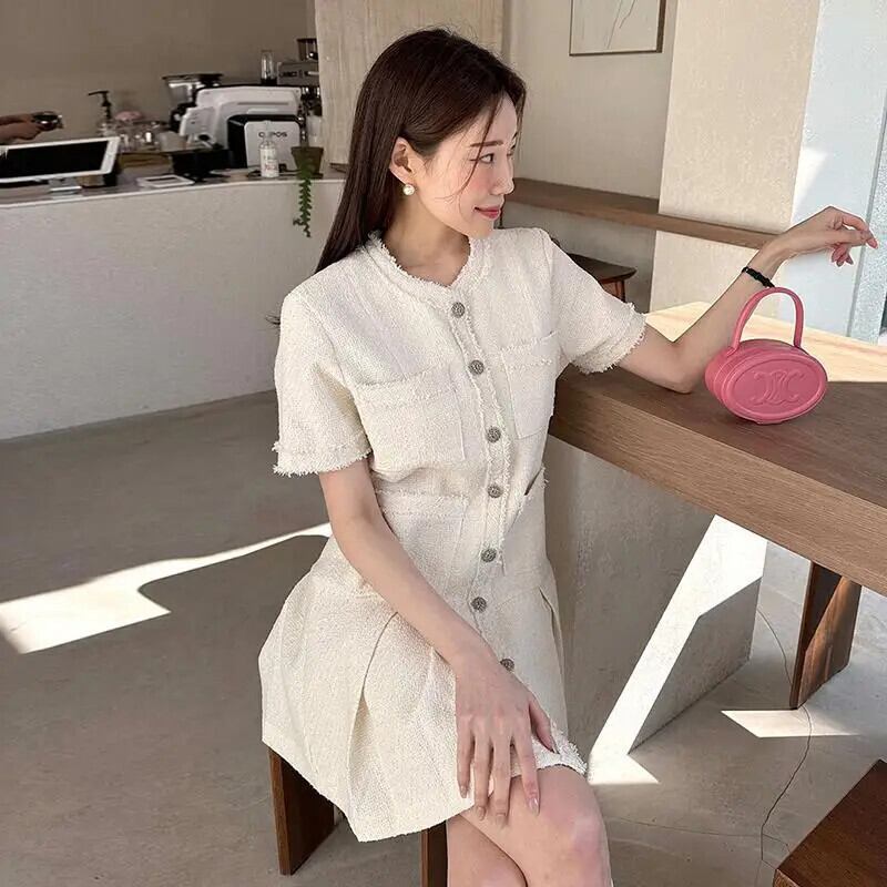 夏レトロスタイルウエスト香り風ルーズフリルエッジ半袖ツイードドレス ショート ハーフスリーブ サマー 夏物