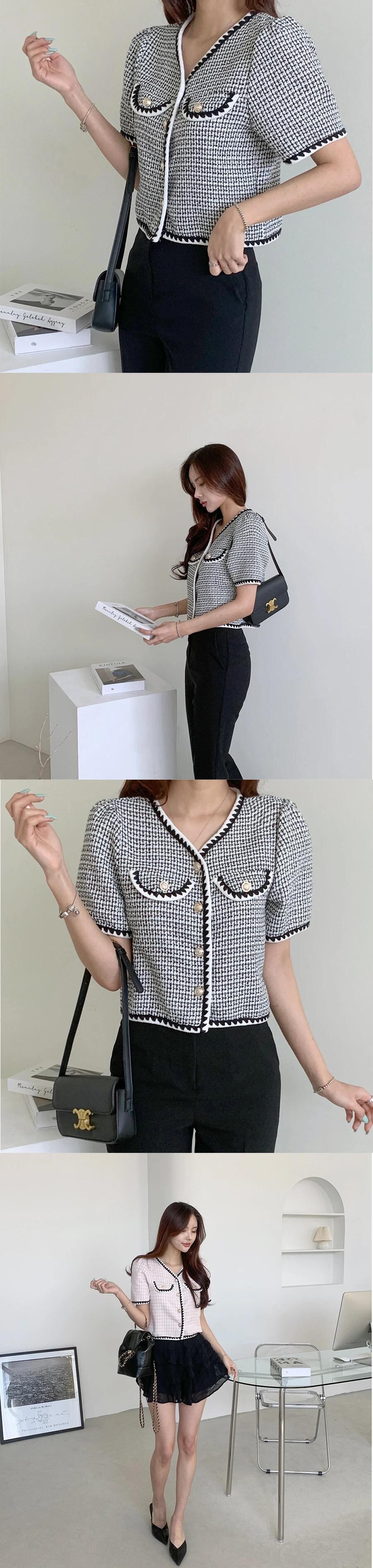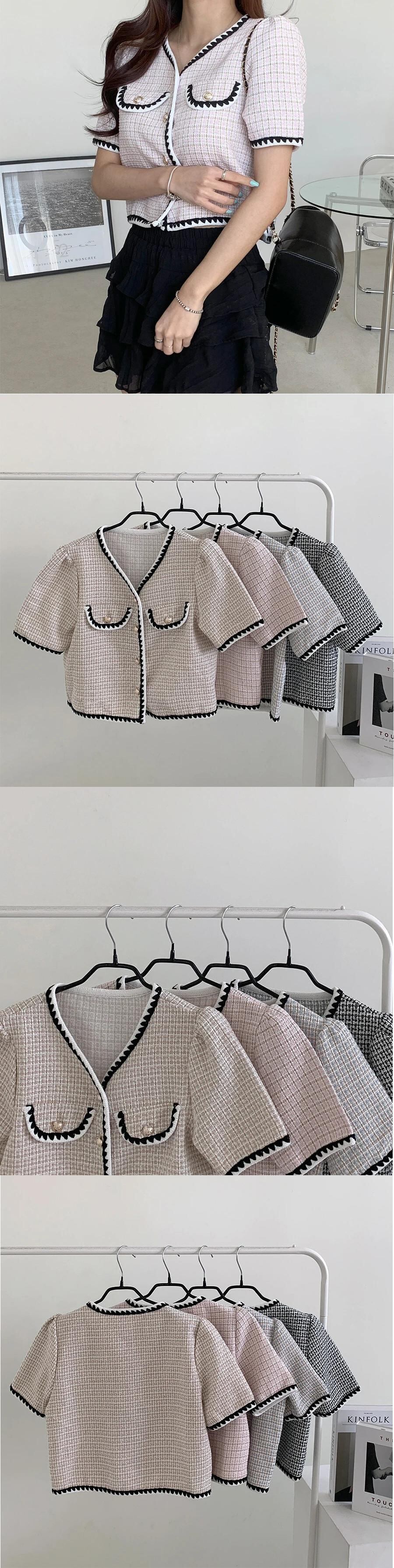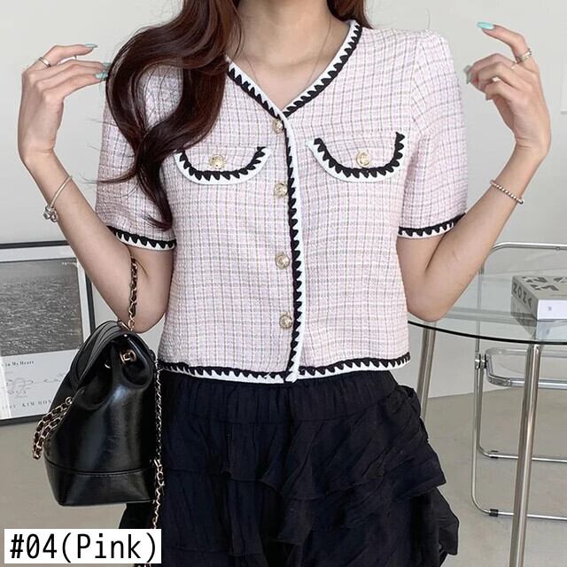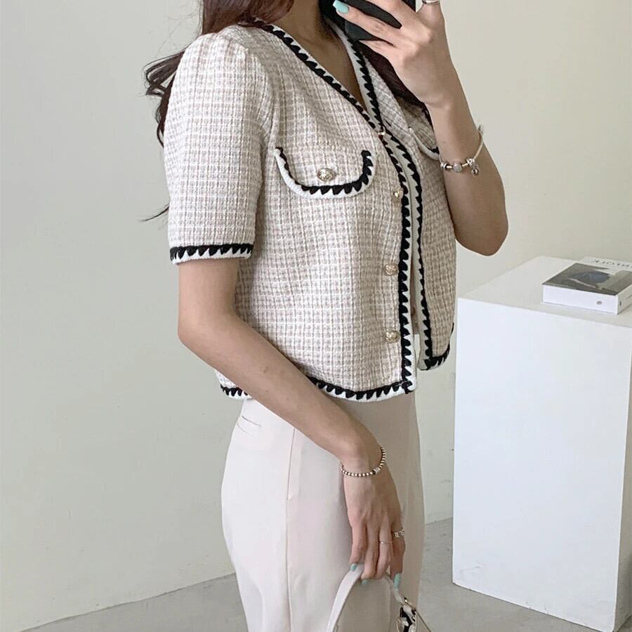 シック夏エレガンス香り V ネックユニークボタン多用途コントラストエッジ半袖チェック柄コートジャケット ショート ハーフスリーブ サマー 夏物 Vネック