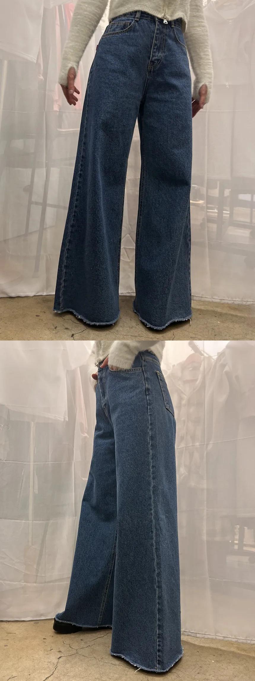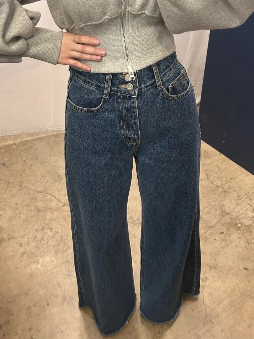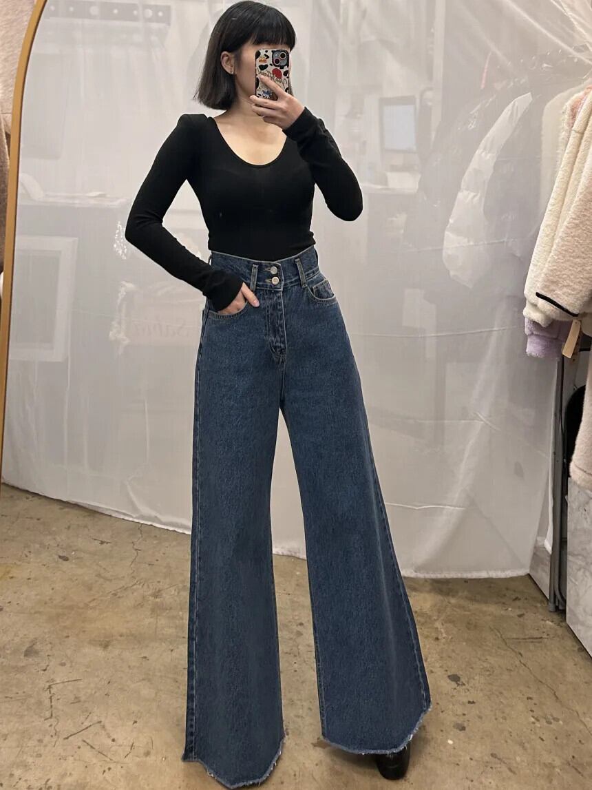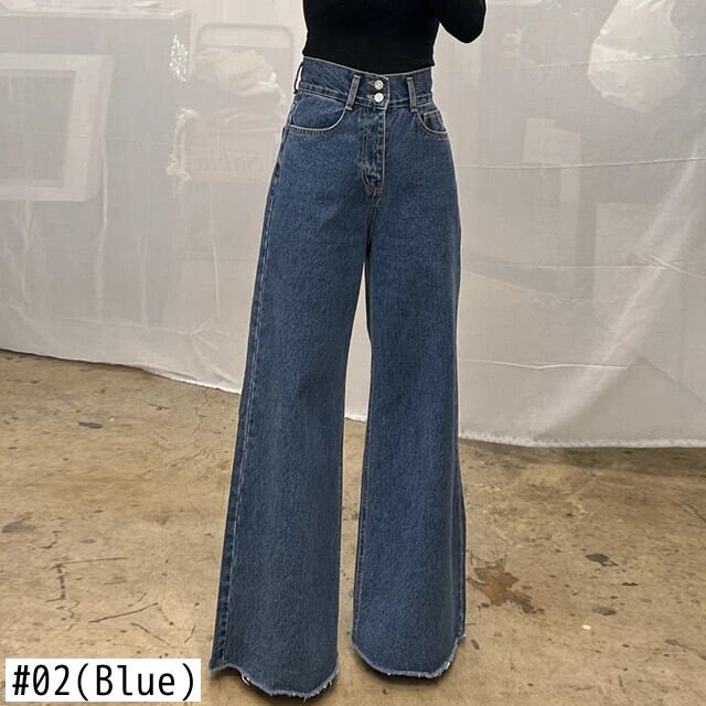 春 秋 デニム パンツ ウエスト 2 ボタン フリース エッジ マイクロ ラグド ストレート ワイドレッグ ジーンズ スプリング 春物 ワイドパンツ