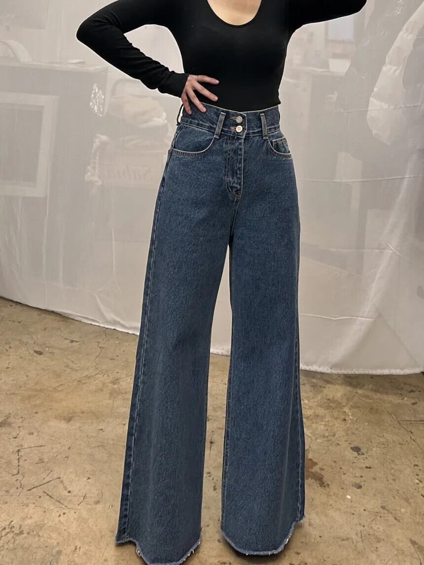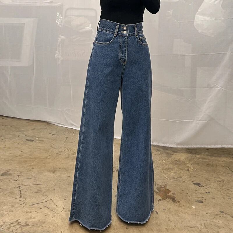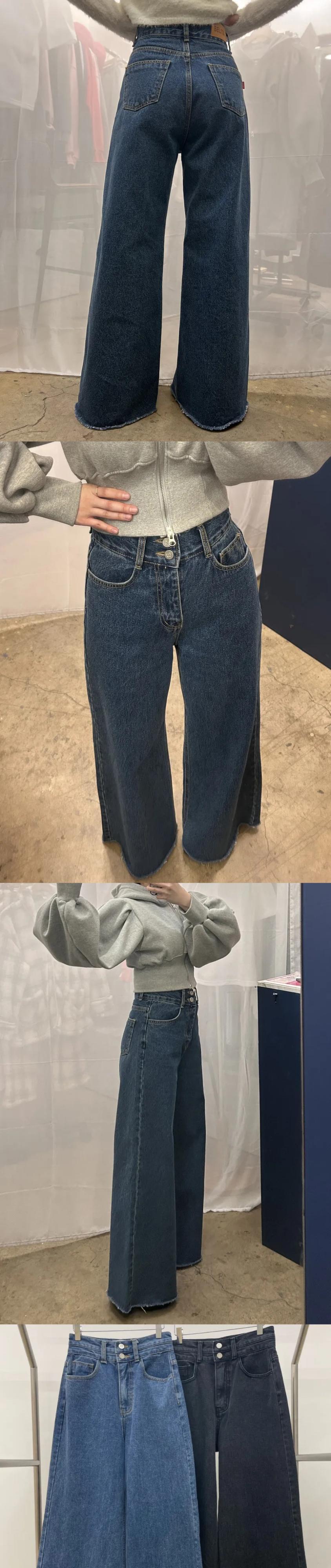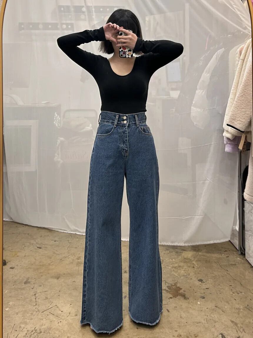 春 秋 デニム パンツ ウエスト 2 ボタン フリース エッジ マイクロ ラグド ストレート ワイドレッグ ジーンズ スプリング 春物 ワイドパンツ