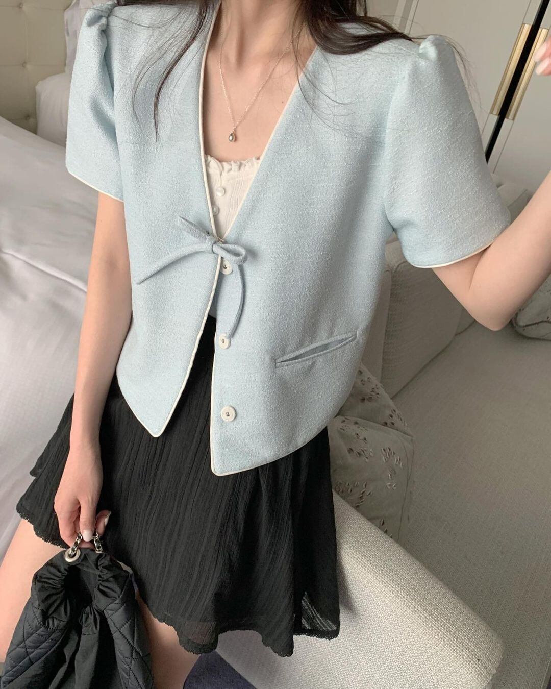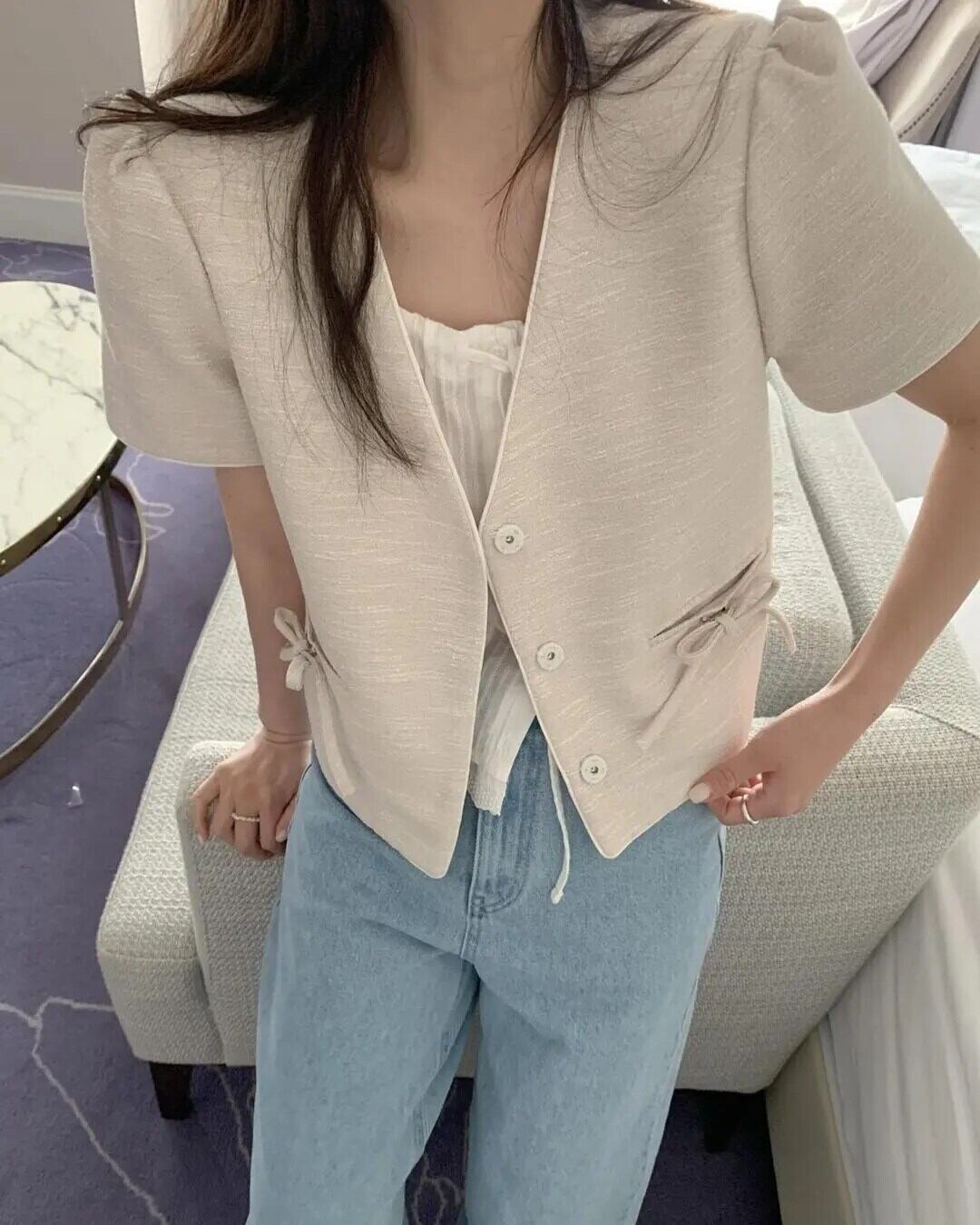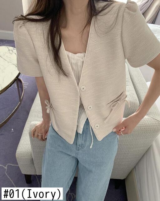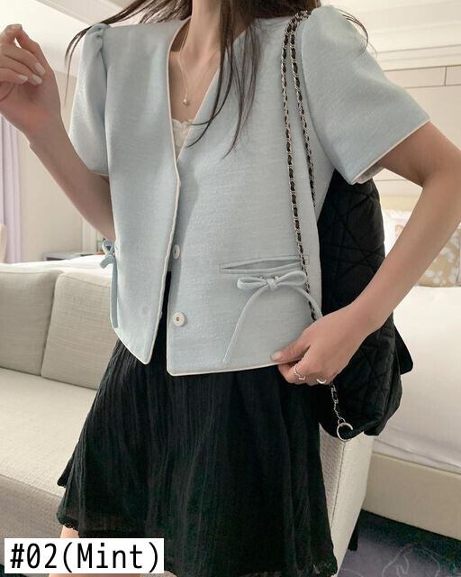 夏気質Vネックリボン装飾ルーズショートSeevedフレグランスジャケットレディースコート サマー 夏物