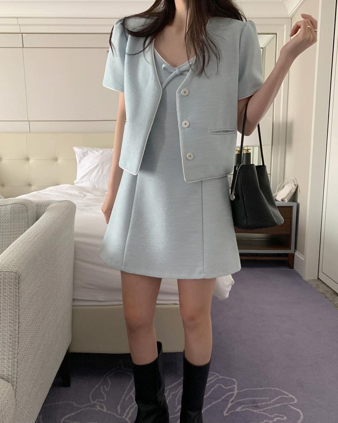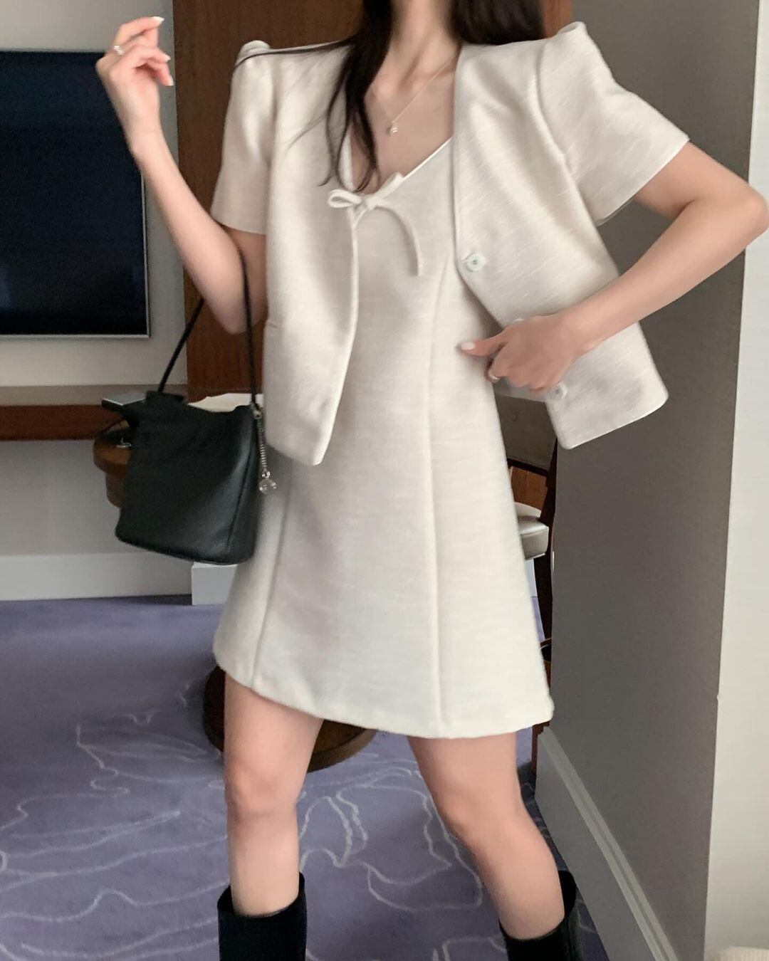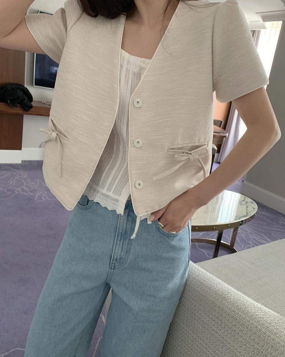 夏気質Vネックリボン装飾ルーズショートSeevedフレグランスジャケットレディースコート サマー 夏物
