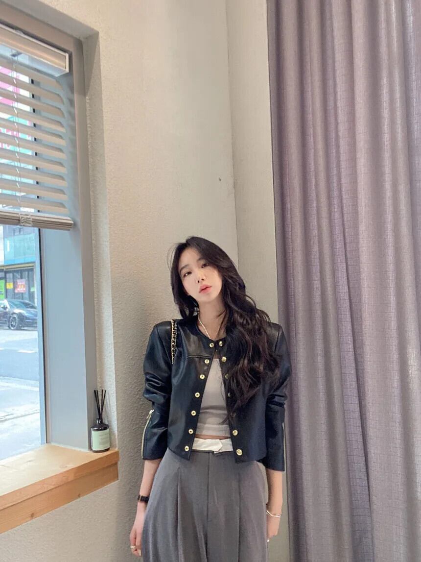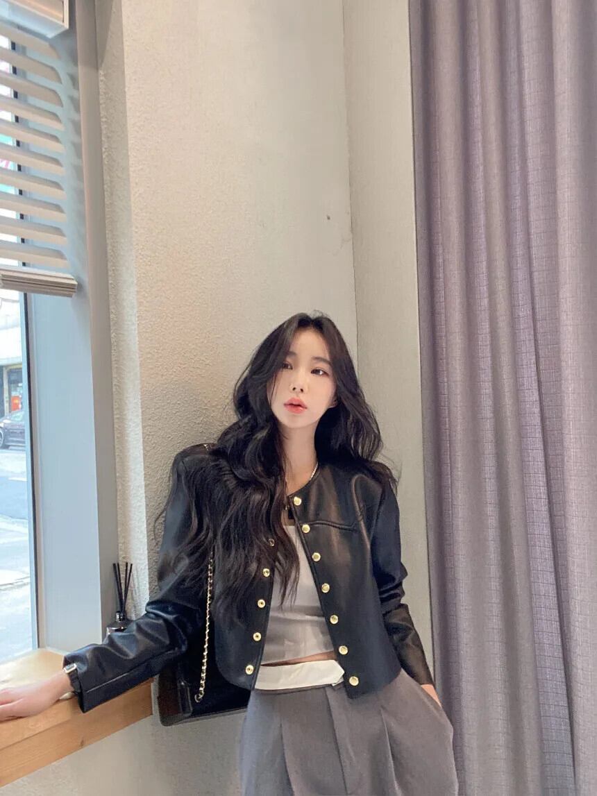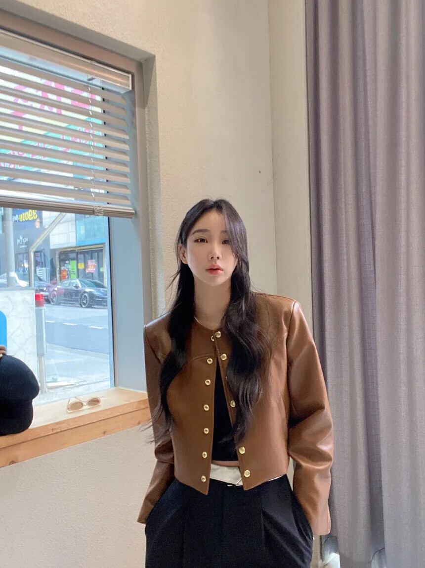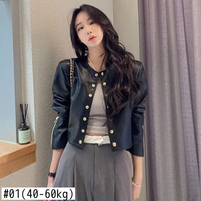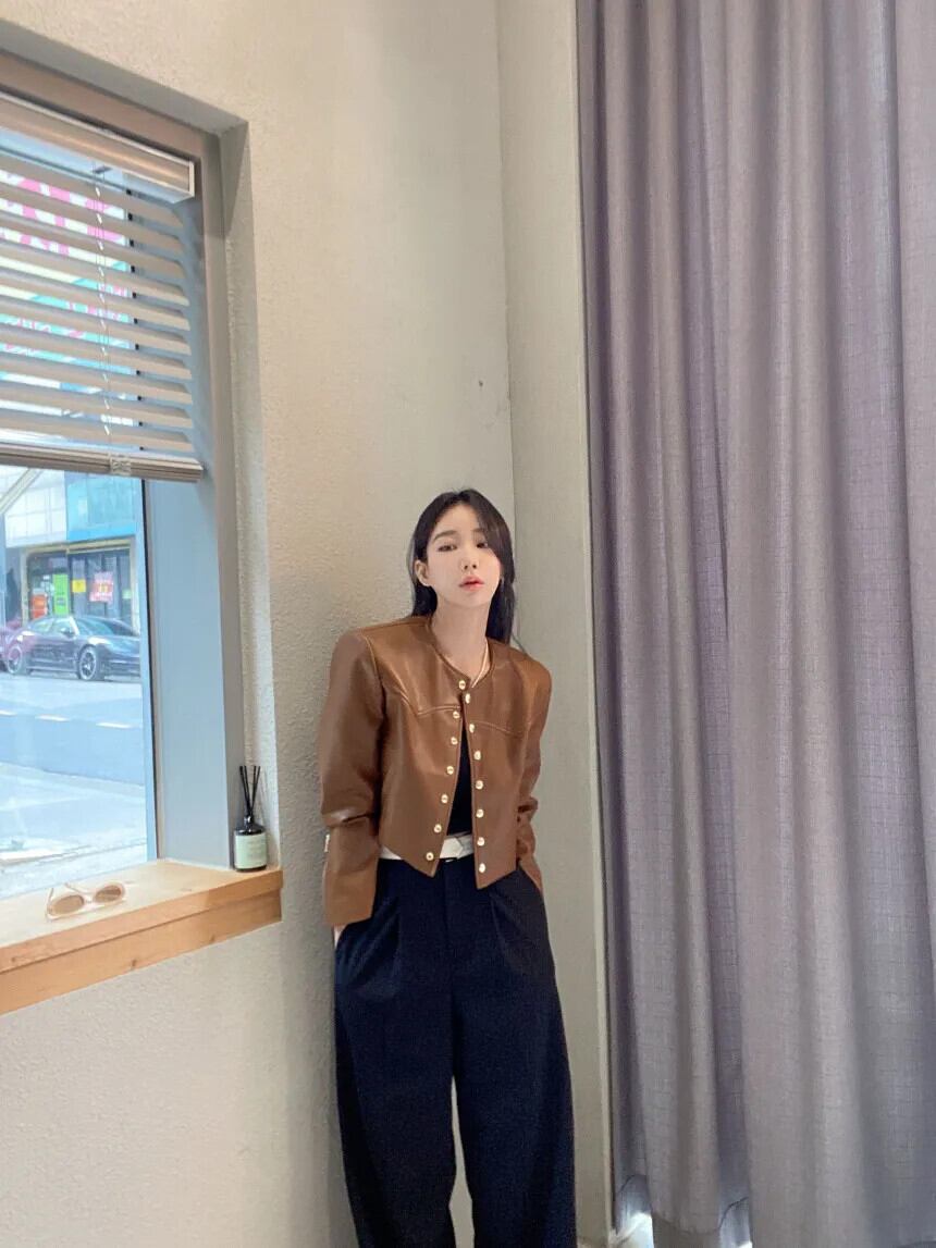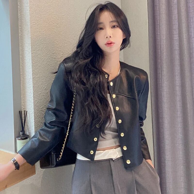 秋レザーコートトレンディ春レトロラウンドネックメタルシングルブレストルーズ PU ジャケット スプリング 春物 オータム 秋物 Oネック