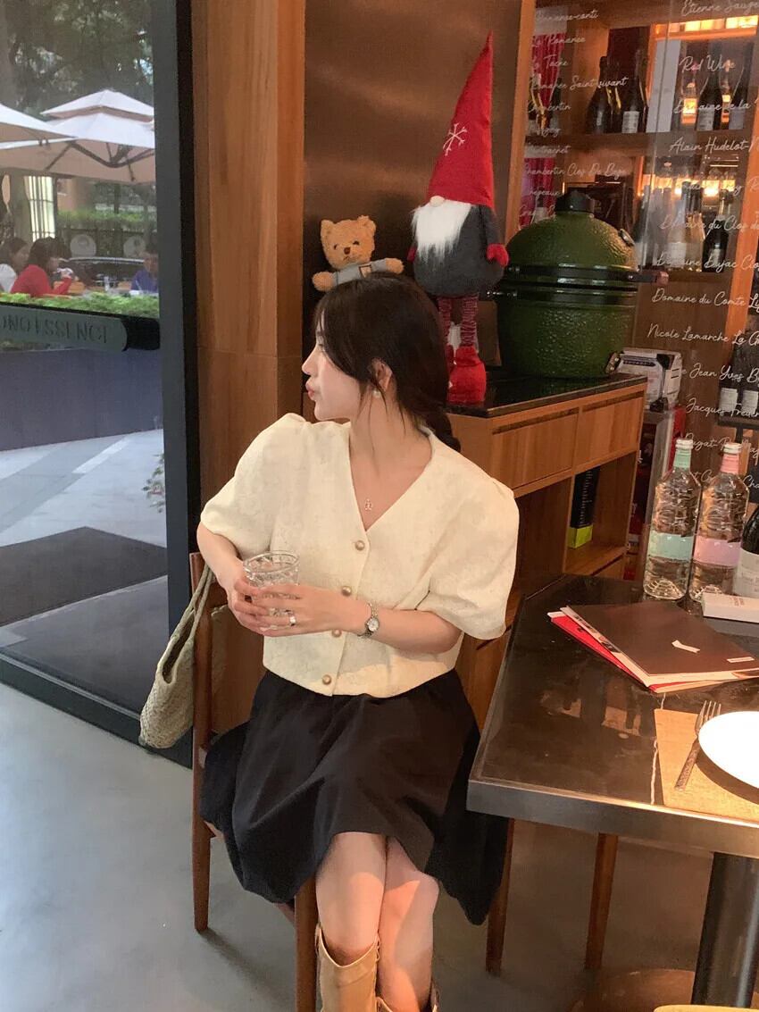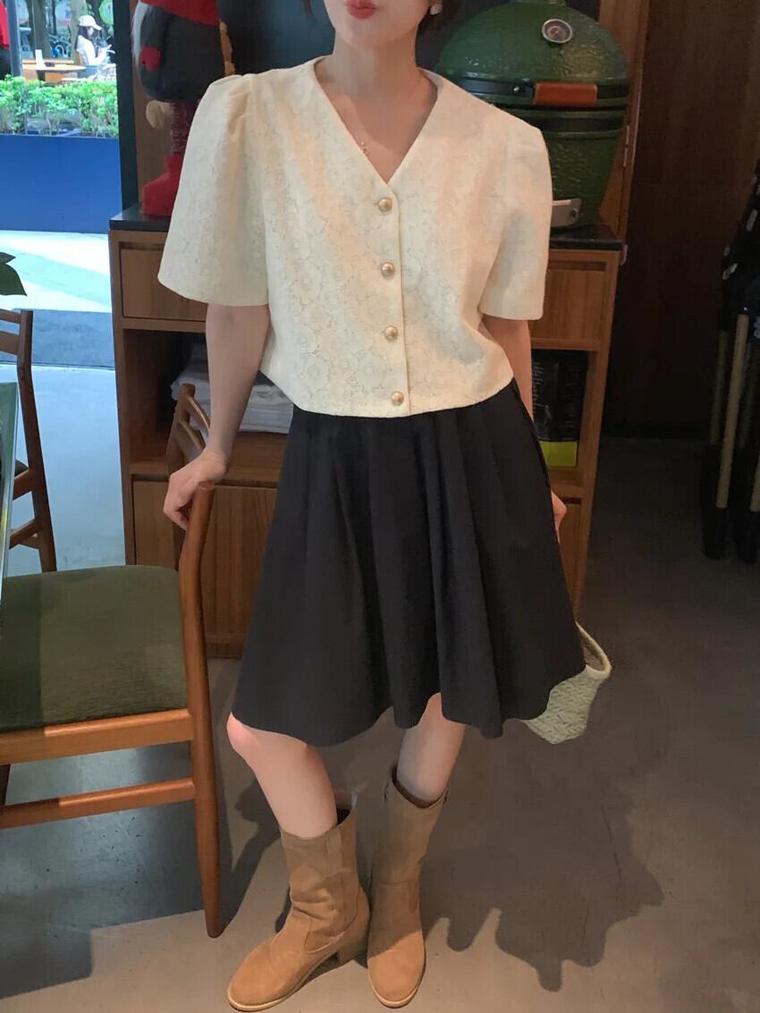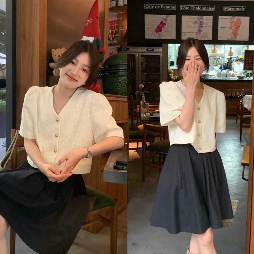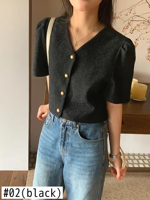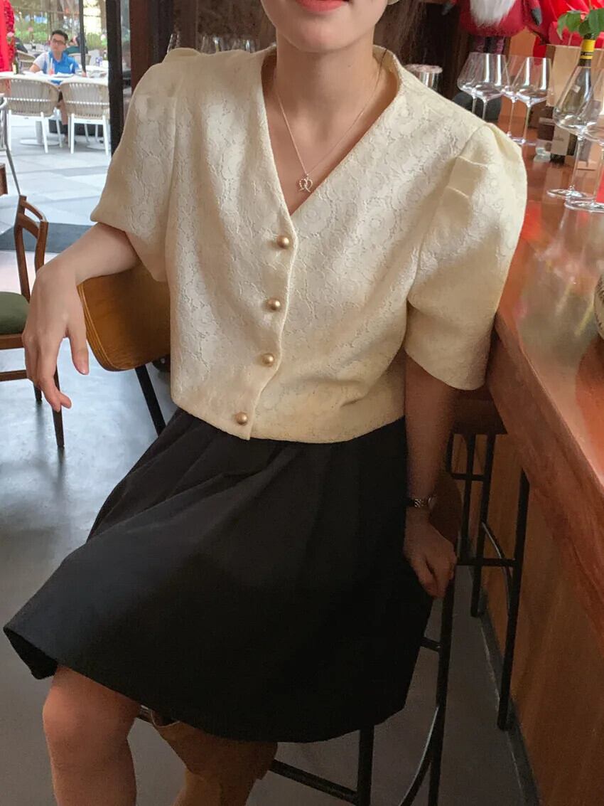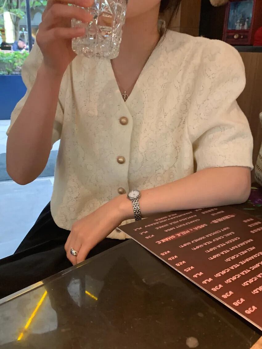 シック夏レトロ香り V ネックシングルブレストレースフックフラワー多用途バブルスリーブコートジャケット サマー 夏物 Vネック フラワーデザイン